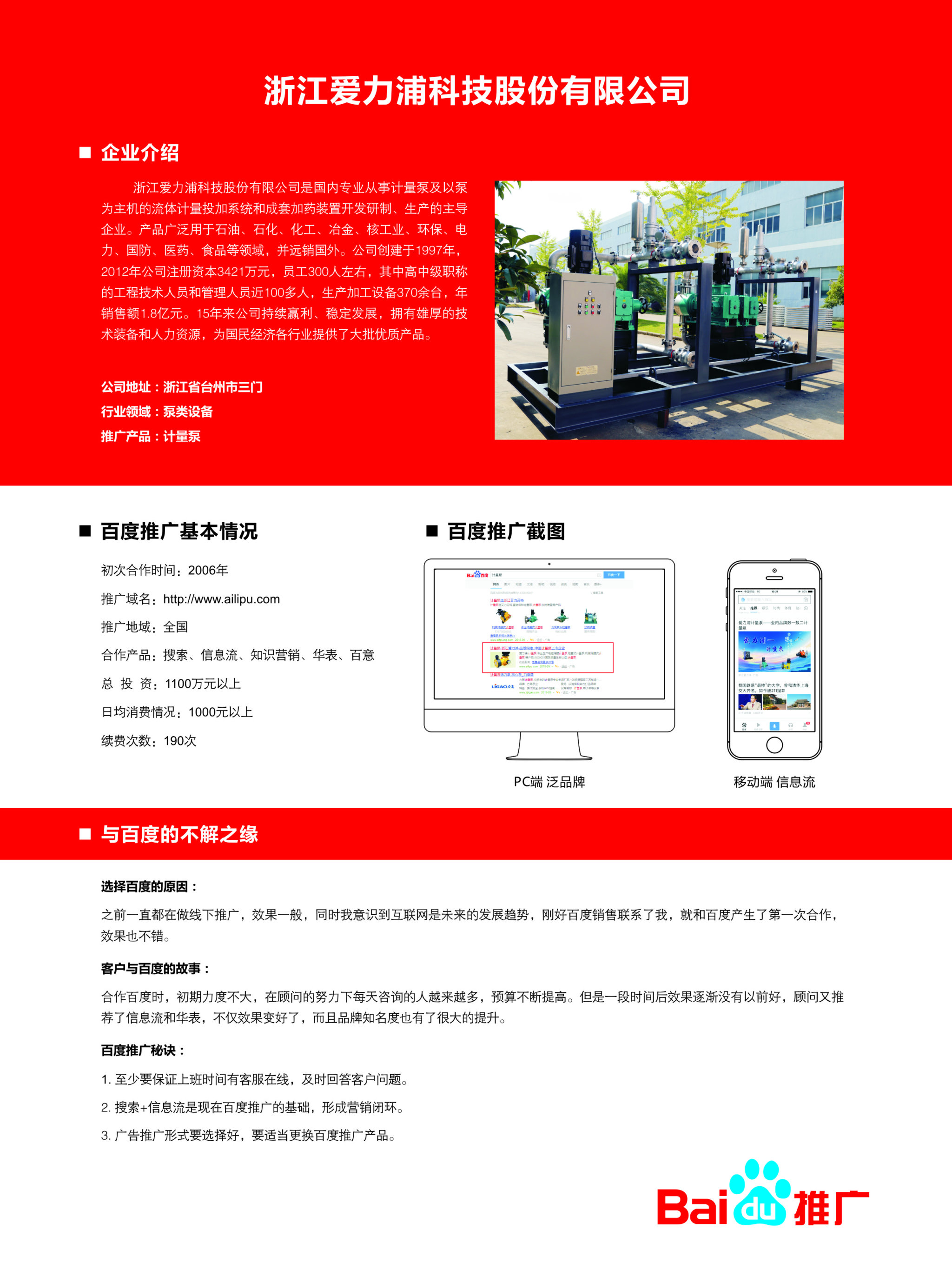 浙江爱力浦科技股份有限公司是国内专业从事计量泵及以泵为主机的流体计量投加系统和成套加药装置开发研制、生产的主导企业。产品广泛用于石油、石化、化工、冶金、核工业、环保、电力、国防、医药、食品等领域,并远销国外。公司创建于1997年,2012年公司注册资本3421万元,员工300人左右,其中高中级职称的工程技术人员和管理人员近100多人,生产加工设备370余台,年销售额1.8亿元。15年来公司持续赢利、稳定发展,拥有雄厚的技术装备和人力资源,为国民经济各行业提供了大批优质产品。