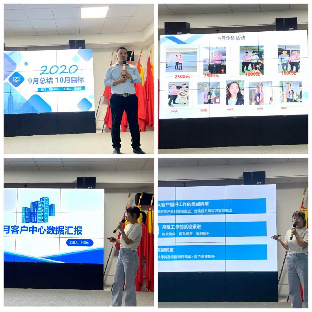 首先,主持人就投诉、考级、帮带、福利四个关键词对9月做着公司总结。紧接着商务中心总监周建锋和客户中心总监向雪辉上台总结9月部门工作并对10月做了规划。